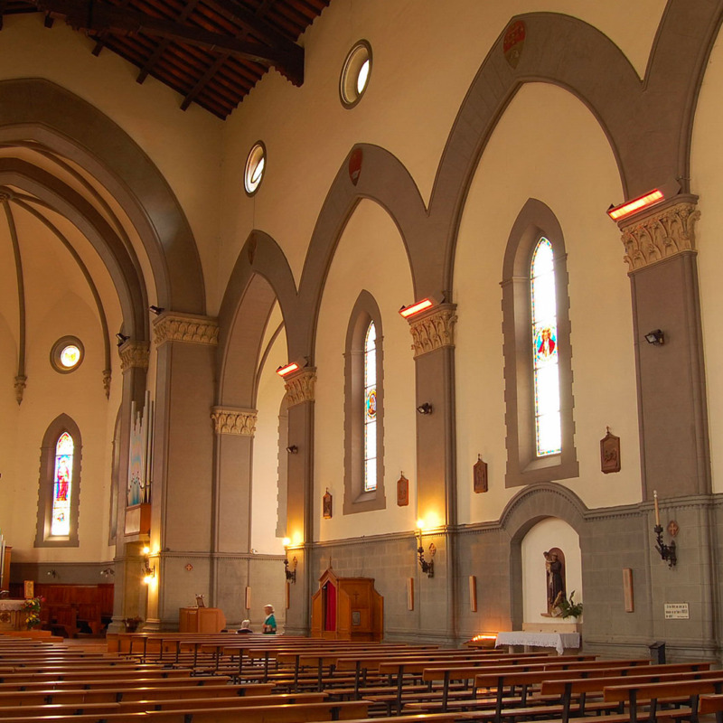 - Places of worship: churches, abbeys and prayer halls, where high ceilings and architecture make conventional heating solutions impractical.
